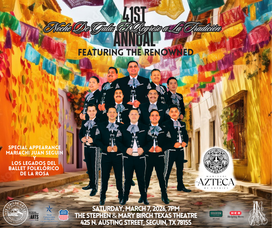 Teatro De Artes De Juan Seguin cordially invites you to celebrate with us at the 41st Annual Noche De Gala: El Regreso a la Tradición on Saturday, March 7, 2026, at 7:00 p.m., at the historic Stephen & Mary Birch Texas Theatre, located at 425 N. Austin Street, Seguin, Texas 78155.