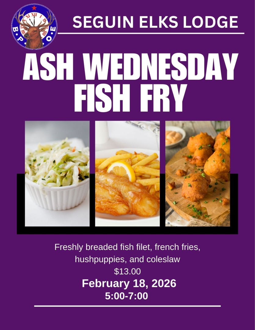 Home Ash Wednesday Fish Fry February 18, 2026 5:00 PM –7:00 PM Overview The Seguin Elks Lodge is hosting a Fish Fry on Ash Wednesday from 5-7 pm Ash Wednesday Fish Fry1331 CH Matthies Jr Seguin, Texas 78155DetailsOpen in Google Maps Save Seguin Elks Lodge 1331 CH Matthies Jr Seguin, Texas 78155 (830) 556-4641 Website