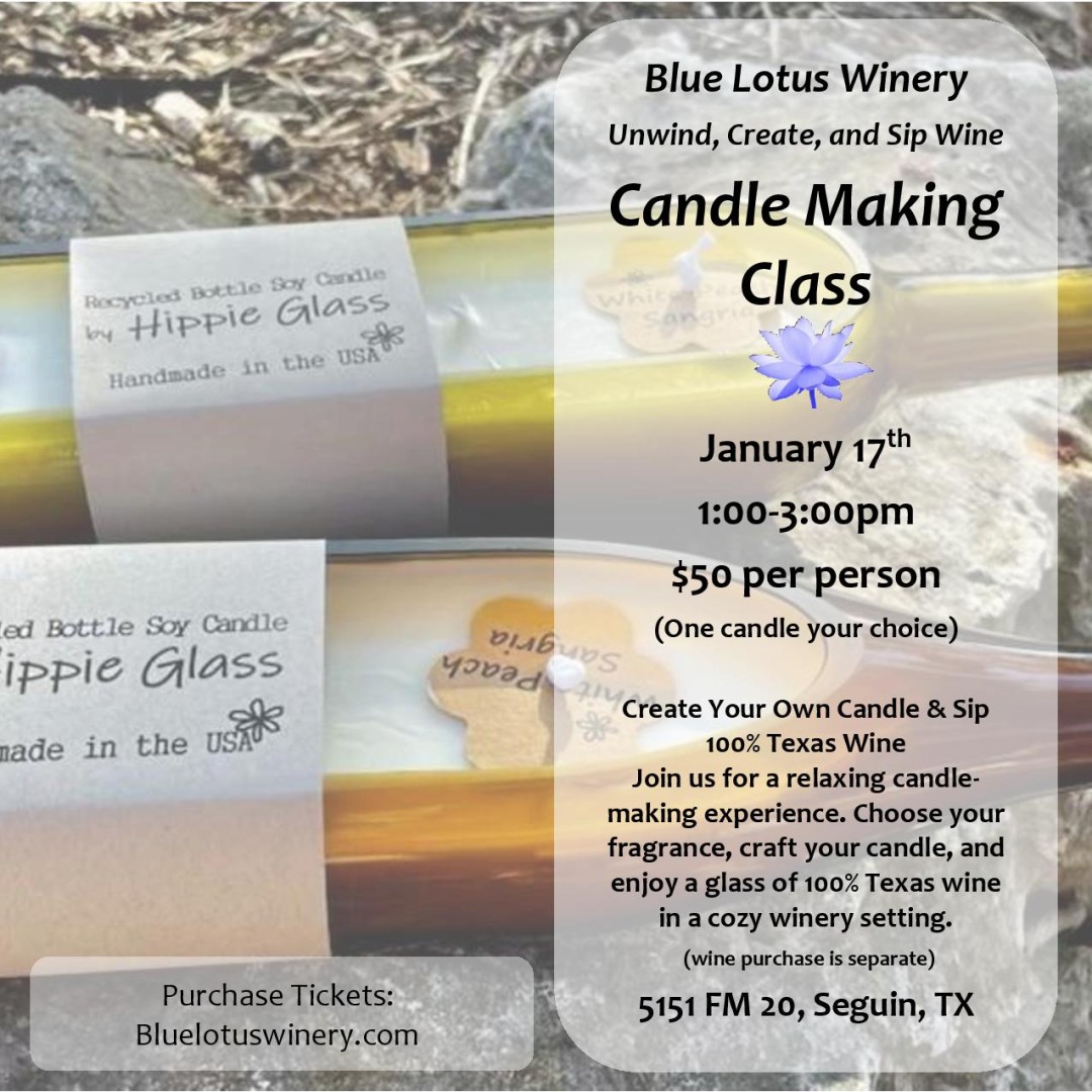 Craft your own candle, choose your favorite fragrance, and sip 100% Texas wine in a cozy winery setting. Join us for a relaxing, hands-on experience where creativity meets great wine.