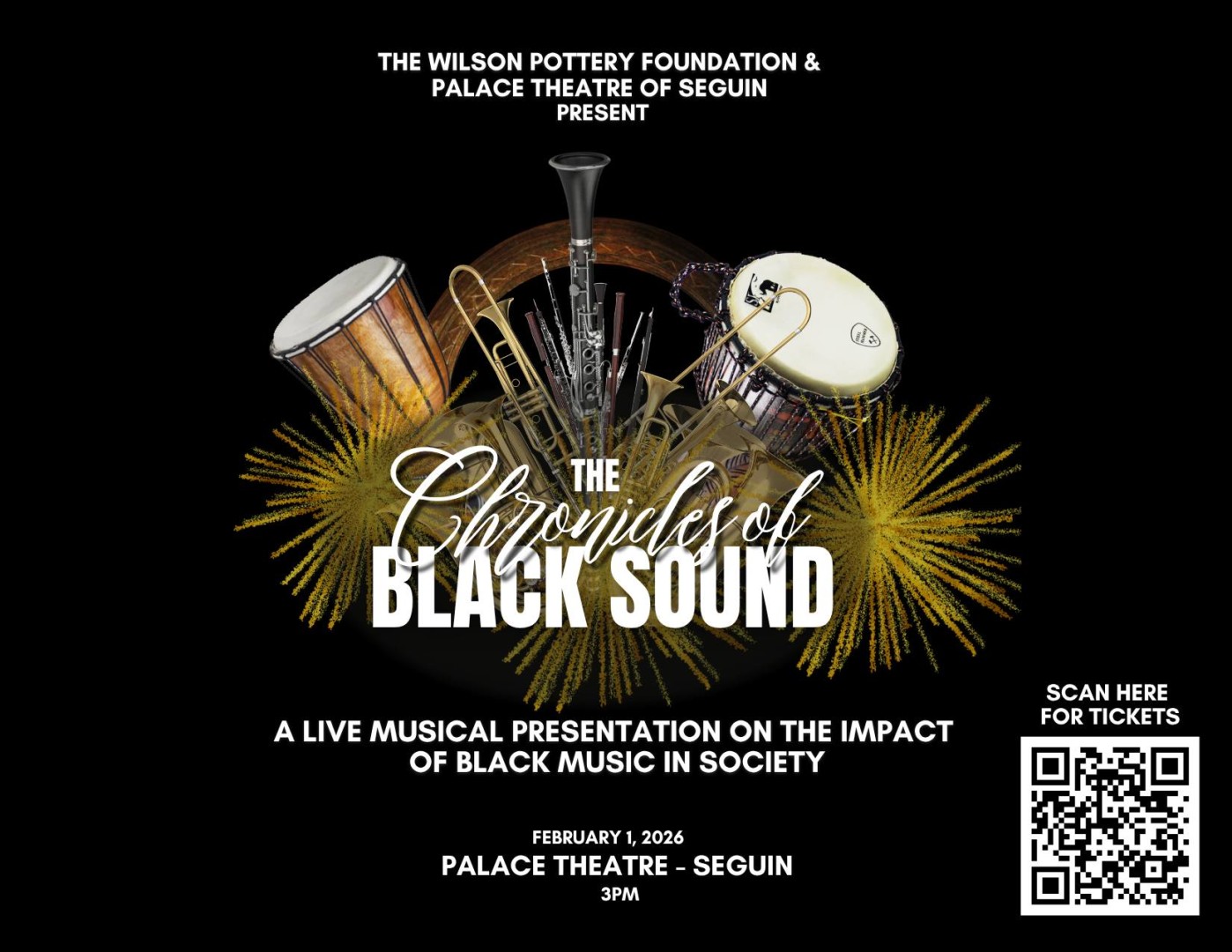 You are invited to join Wilson Pottery Foundation as we kick off Black History Month Feb 1, 2026, 3pm at the Palace Theatre in Seguin with a vibrant celebration of and exploration of live musical and dance performances journeying through Jazz, Blues, Country, Rock, Gospel and an ensemble concert of R & B performed by Music ForYa Soul.