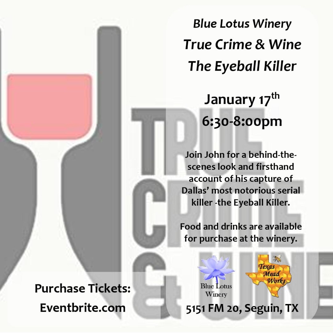 Join us for an unforgettable True Crime Evening as John shares a behind-the-scenes look and firsthand account of his capture of Dallas’ most notorious serial killer — the Eyeball Killer.