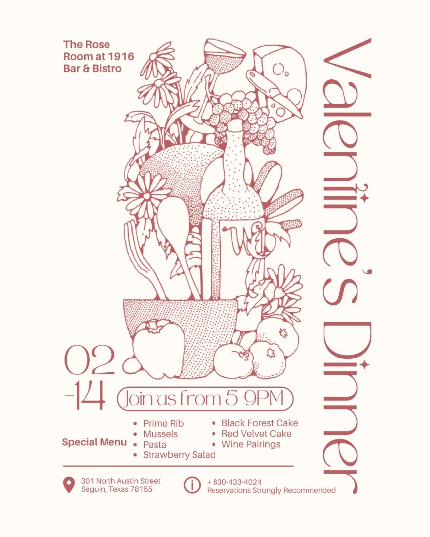 Join us in the Rose Room for Valentine’s Dinner on 2/14 from 5–9PM.