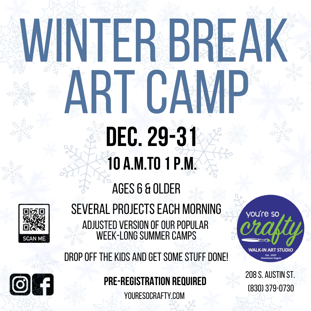Kids ages 6 and up are invited to You're So Crafty's Winter Break Art Camp - Dec. 29-31. We'll do several fun crafts per morning and end with a short Art Show. Registration required.